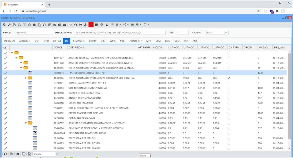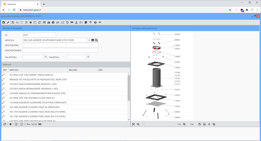 GeQO permette di gestire l'insieme dei componenti di ogni articolo, dal disegno tecnico ai cicli di lavorazione, di condividere la documentazione e di definire ergole e flussi operativi, divenendo il riferimento univoco per tutte le figure coinvolte nel processo produttivo e commerciale.