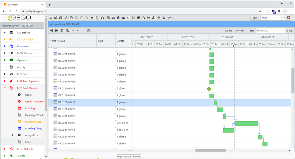 - Generazione di gantt da cicli di produzione finiti e da esplosione MRP